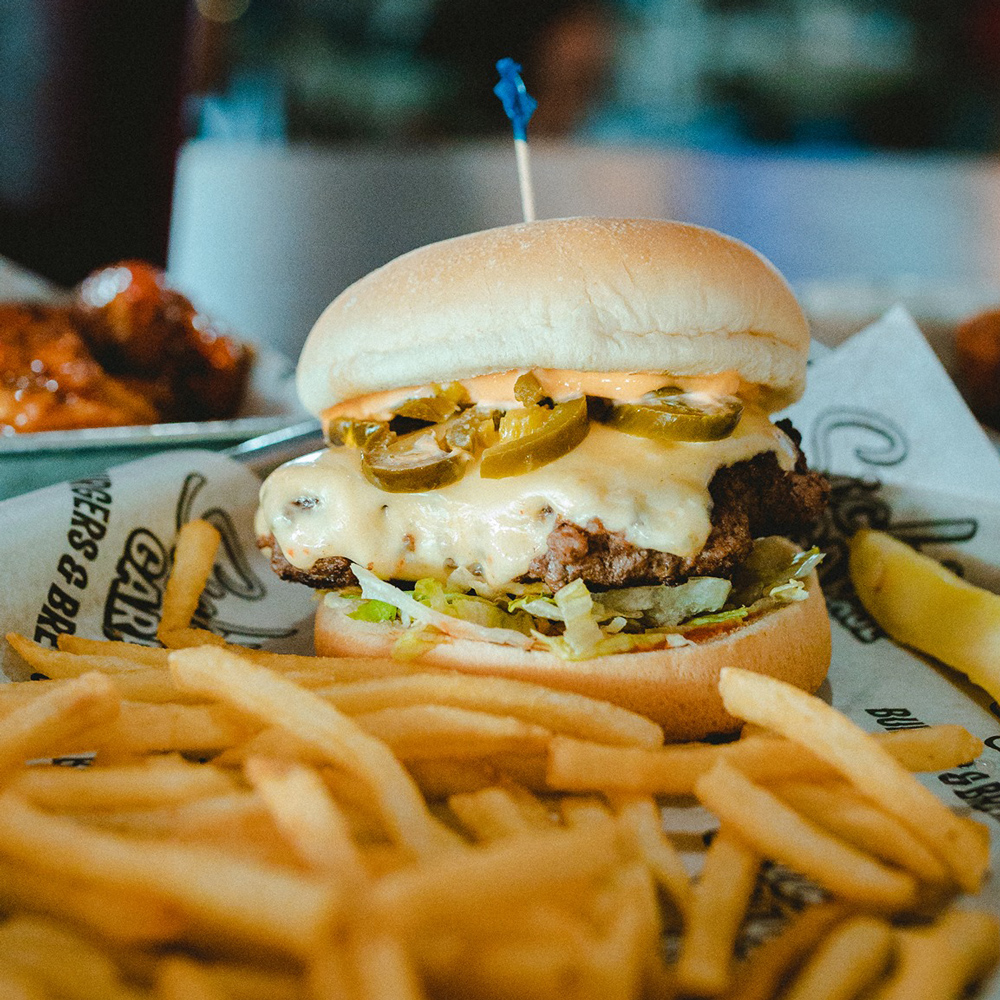 The eatery offers a combination of local craft beers, imported brews, and other drinks. Food options include burgers, sandwiches, wings, mac and cheese, and more. Visit this gem at Town Square and have a good time.