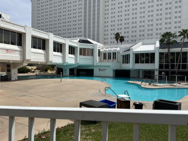 As I join the crowd of looky-loos headed outside, I realize I've never seen the Tropicana pool. Why would I have? I never stayed at the hotel. We walk under a curiously low ceiling- has it always been that low, perhaps a nod to its early days in the 60s?
