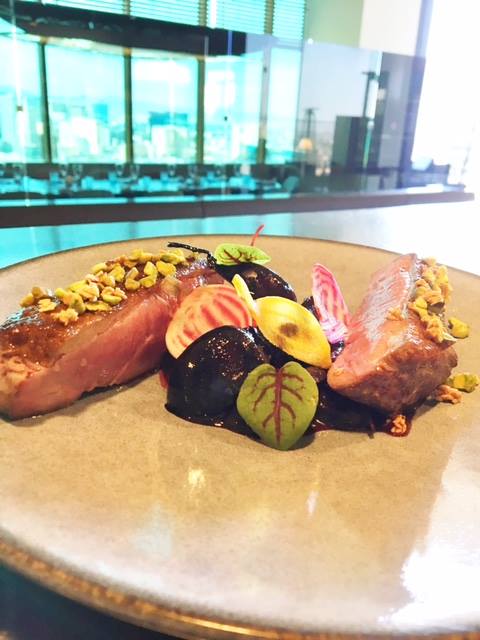 Liberty duck breast, cherry, beat, and pistachios at Rivea.[/caption]