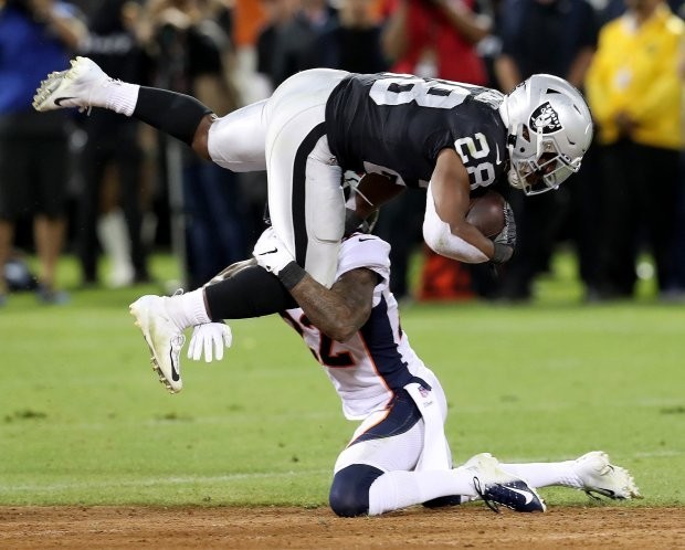 Joshua Jacobs is an elite running back, and he proved it by putting the team on his back for a 28-yard touchdown in the fourth quarter. Not only would this play tie the game at 24, but it also came after a fumble and two interceptions by Derek Carr. This is proof that Jacobs can punch one in there when it's crunch time.