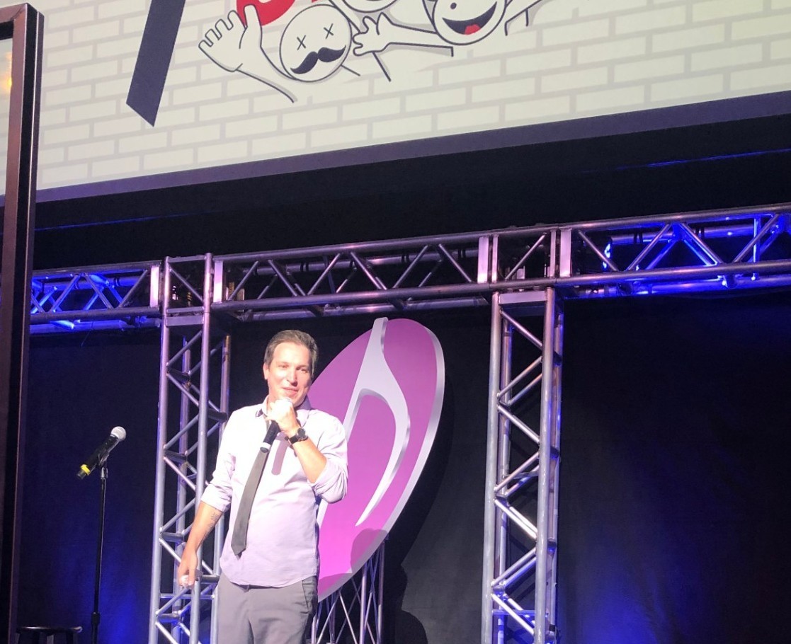 The interior reminds me of a swanky lounge. Soft purple lighting, socially distanced tables. A cocktail waitress slinking through the room. I’m waiting for my first drink when John Hilder bounds on a stage. He’s the show’s host and opening comedian.
