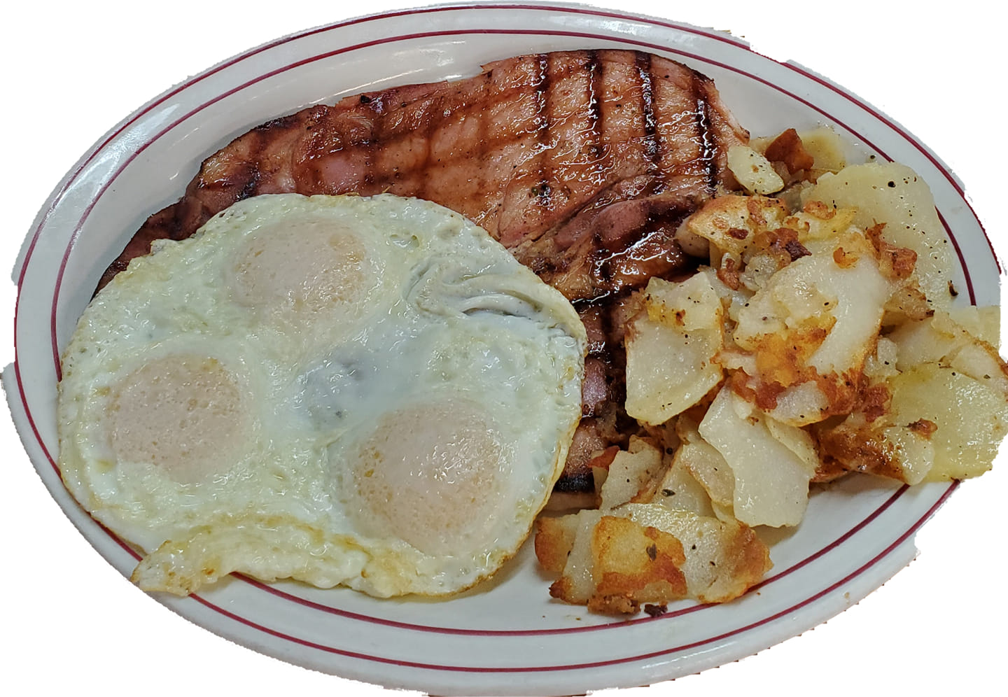 Breakfast is served all day. It includes muffins, hotcakes, hot cereal, French toast, hamburgers, eggs, and rib-eye steak.
