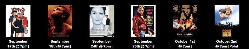The schedule kicks off with King Pin on the 17th and continues with The Beach, starring Leonardo DiCaprio, on the 18th. The rest of the lineup includes Notting Hill, James Dean s Rebel Without A Cause, the classic Bond film Goldeneye, Point Break, Dirty Dancing, Pretty Woman, and more!