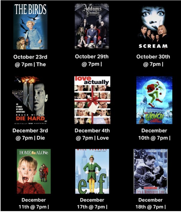 The rooftop will also feature Halloween classics like Psycho, The Exorcist, The Addams Family, and Hocus Pocus. Get into the Christmas spirit here too! All December long catch holiday movies like Die Hard, Home Alone, The Grinch, Elf, and the famous classic It s a Wonderful Life.
