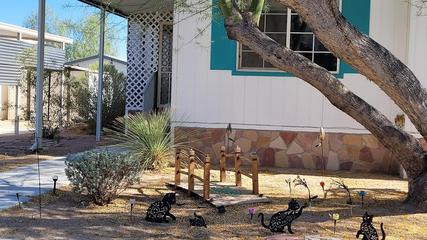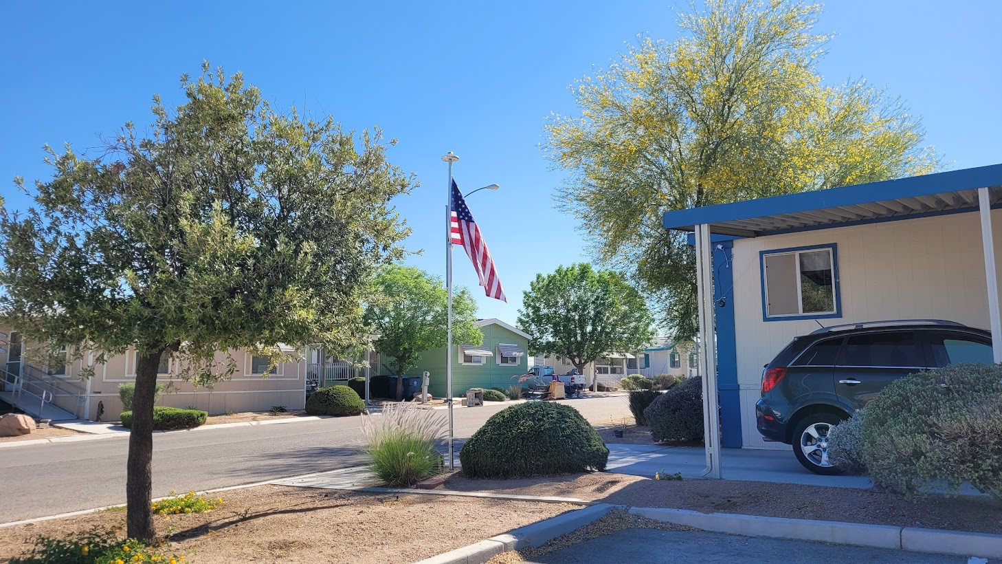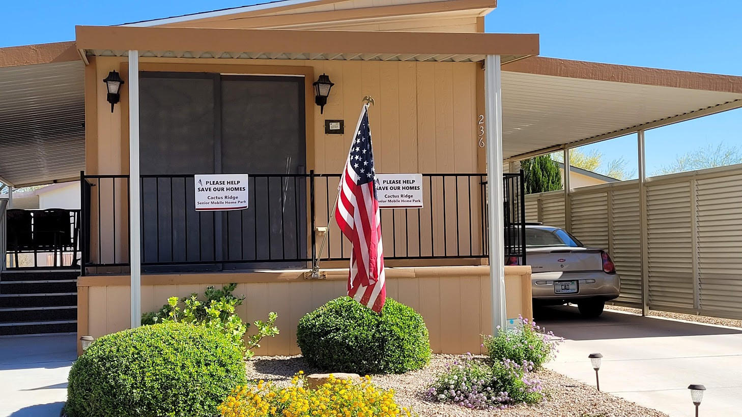 Mr. and Mrs. Mitchell, the Houlettes, and others at Cactus Ridge see their residences as "houses", not "mobile homes". With meticulously-kept landscaping, porches, backyard storage sheds, flag poles, and charming personal accents, the individual homes project a sense of pride and permanence.