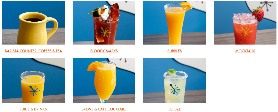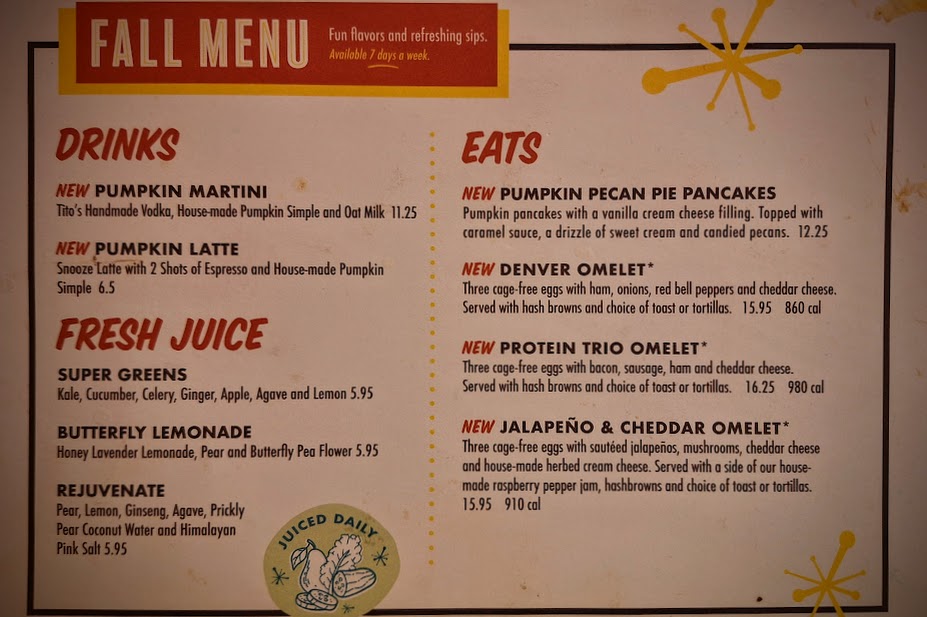 Whatever your thirst calls out for, the SNOOZE Drinks Menu will have a response. It's truly massive but presented in a playful way that doesn't overwhelm. Traditional coffee and fancier varieties from the Barista Counter, cocktails and mocktails, bubbly mimosas and grand Bloody Marys...they're all here along with fresh juices, lemonade, Boozy Blood Orange Punch, or this fall's Pumpkin Martini.