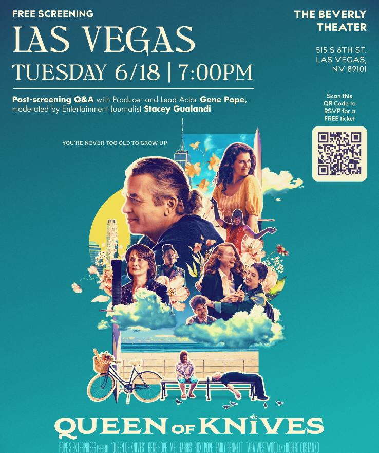 The Queen of Knives screening on June 18th will include a "fireside chat" with star Gene Pope. He'll pull back the curtain on creating a film from script to screen. Las Vegas resident Stacey Gualandi will host the event. Gualandi is an Emmy-winning journalist whose credits include Entertainment Tonight, EXTRA, Inside Edition, and Chic Compass Magazine.